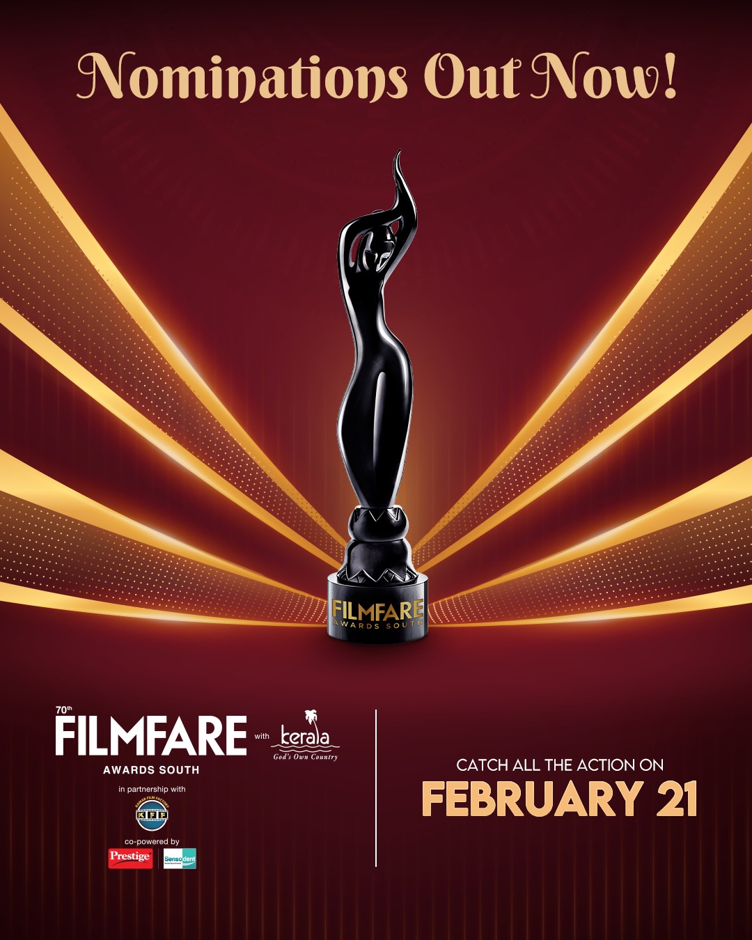 Filmfare announced the nominations for 70th Filmfare Awards South with Kerala Tourism, honouring outstanding talent and cinematic excellence across Malayalam, Kannada, Tamil and Telugu cinema for films released in 2024. For the first time, the awards will be held in Kochi on 21st February 2026 at Adlux International Convention Centre.